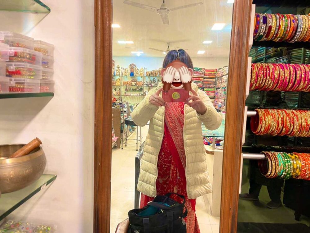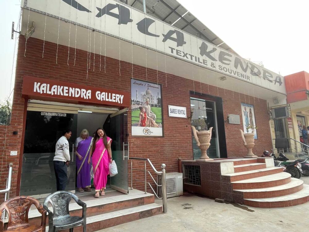 途中で日本語ガイドと合流。車に乗り合わせて向かったのは、おすすめされたサリー衣装レンタル。面白いので借りることに。3000Rp。