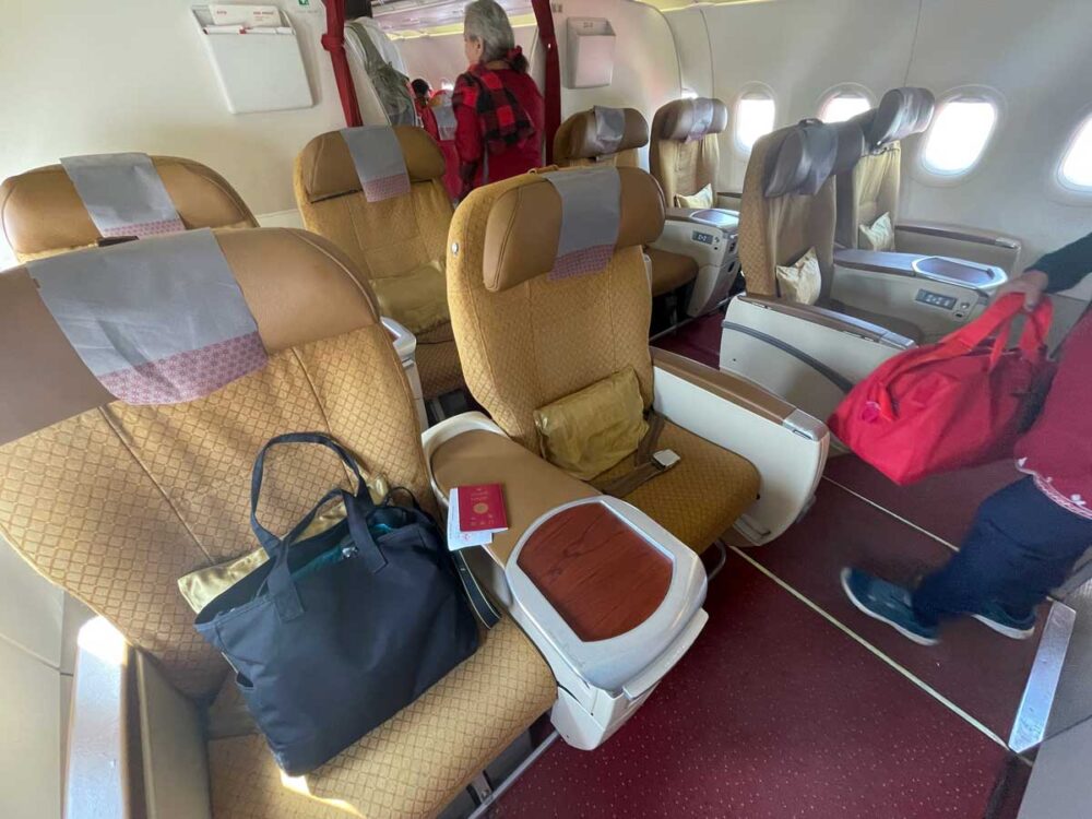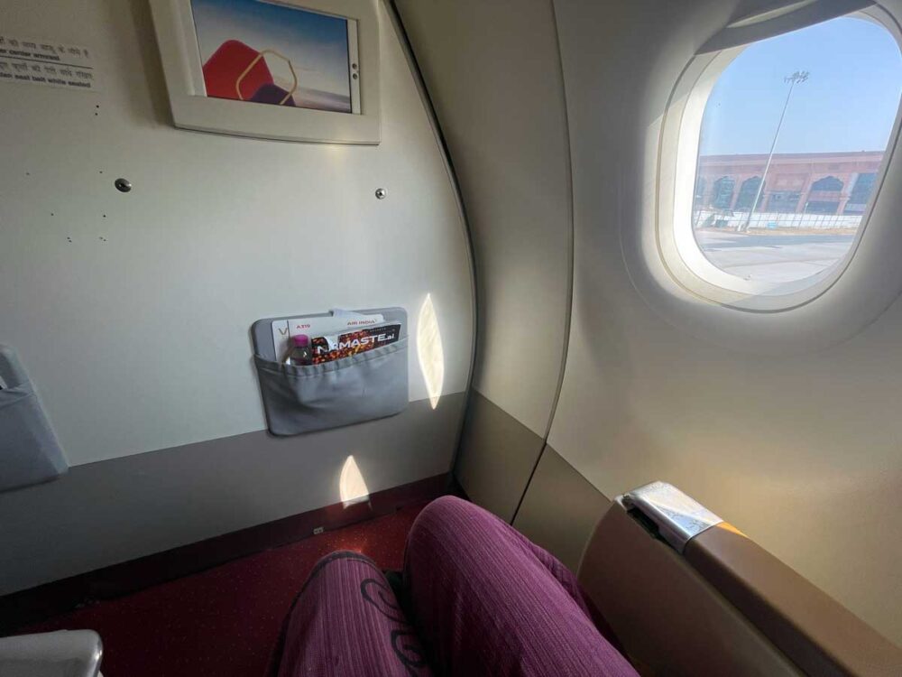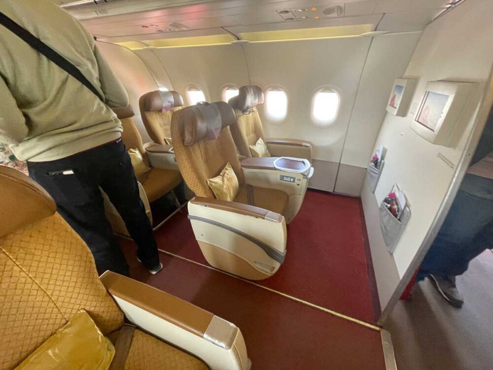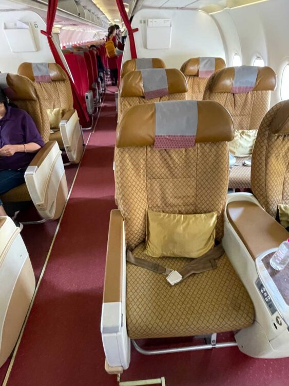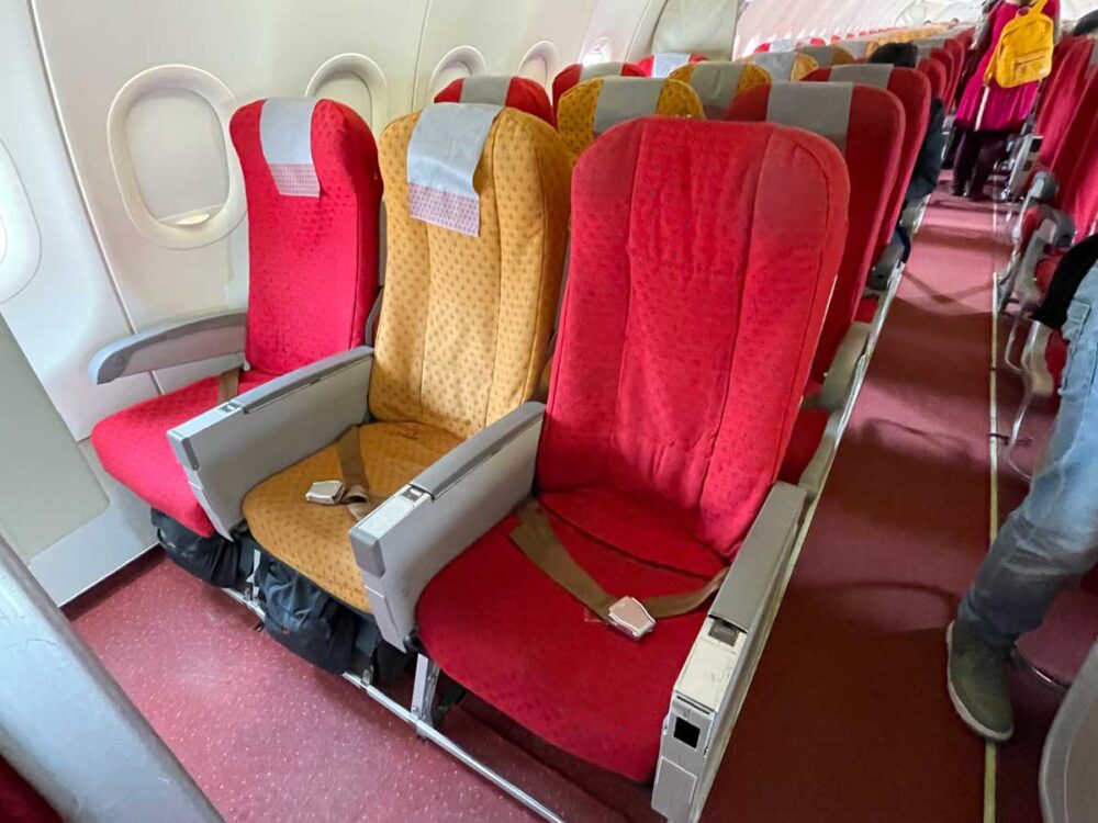 機材はエアバス321中型機。ビジネスの座席は2-2、エコノミーは3-3の並びです。カラフルな赤とベージュのインテリアが華やかでどこかインドっぽく可愛い。