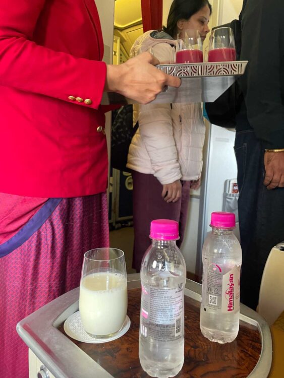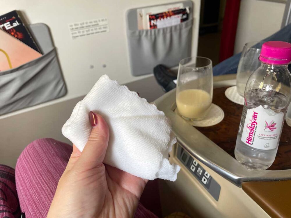座性には小さなクッションと水があらかじめ置いてありました。ウエルカムドリンクはインドの国民的飲み物「スパイシー飲むヨーグルト」かフルーツジュースの2択。おしぼりはホットかコールドか選べました。暑い国ならでは。