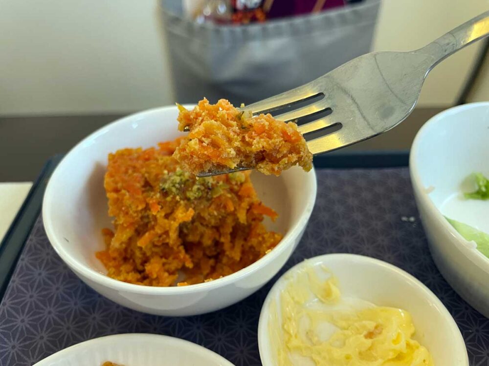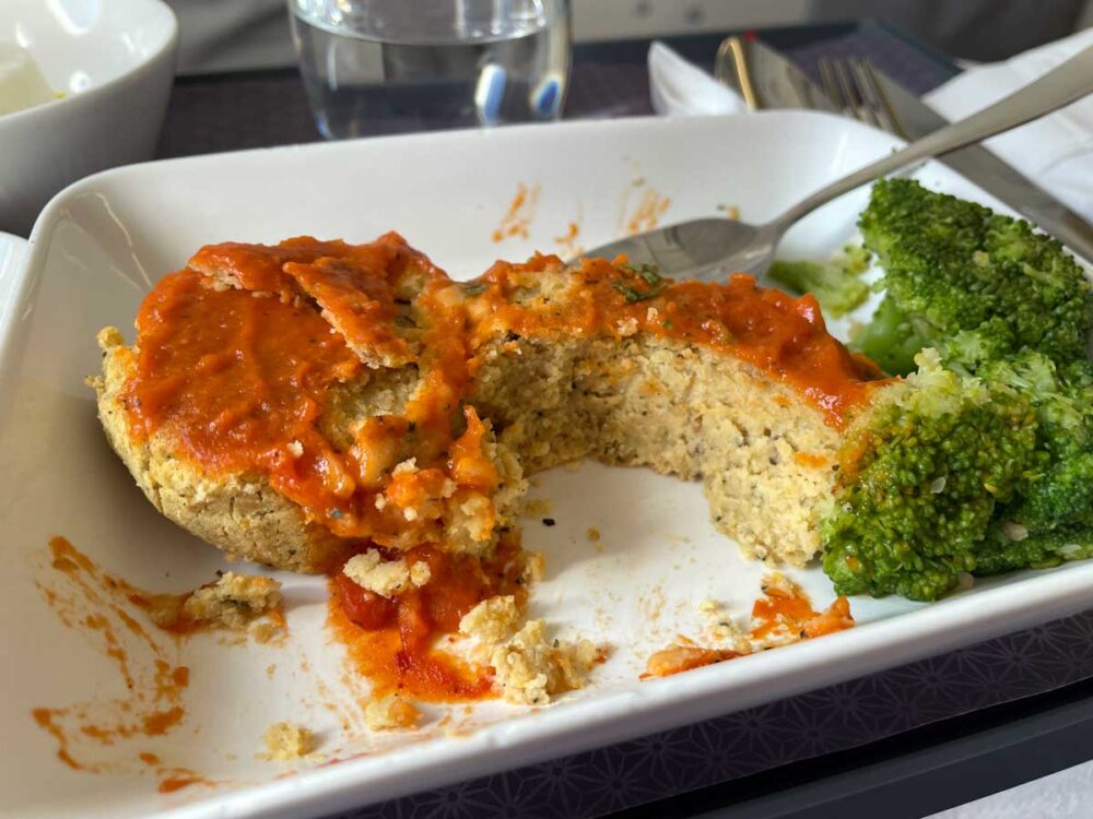 しばらくして機内食。短距離でもしっかりいただけました。さすがビジネス。2種類から選べて、野菜ハンバーグみたいなものと、カレー。メニューがなくて口頭確認だったのであまり聞き取れず。カレーは避けたいので野菜ハンバーグ。お芋と野菜のパテみたいな?ベジタリアン料理です。ブロッコリーが美味しかった。カレーは3枚目の写真にお隣の席の方のがちらり。