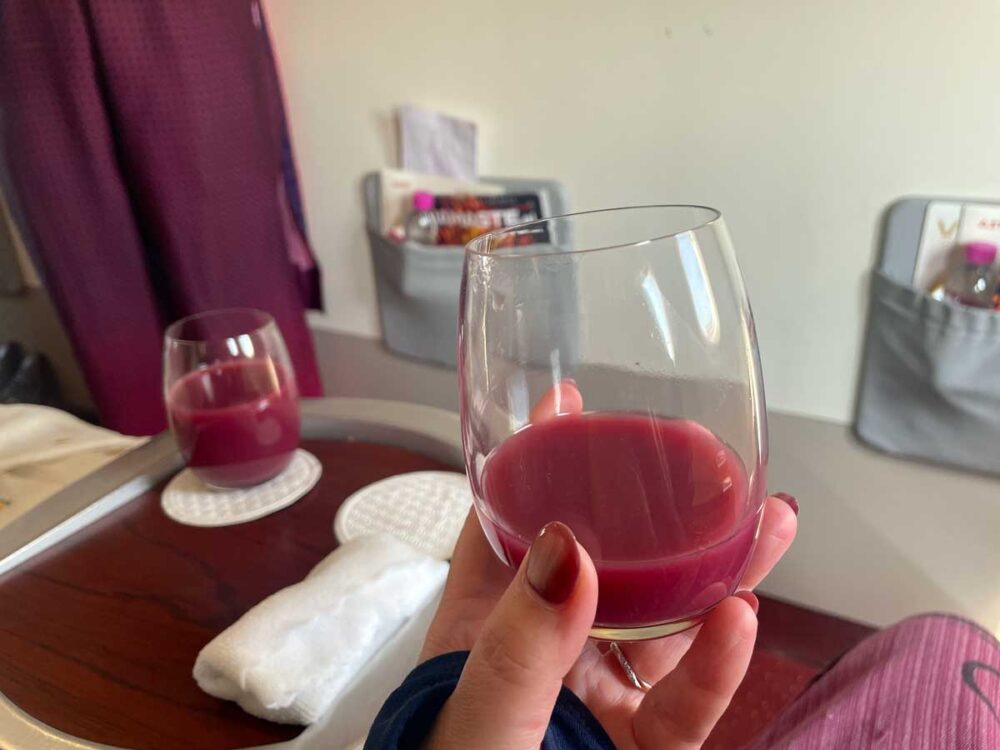 ウエルカムドリンクは白いのは懲りたのでジュースにしました。ワインみたいな色。