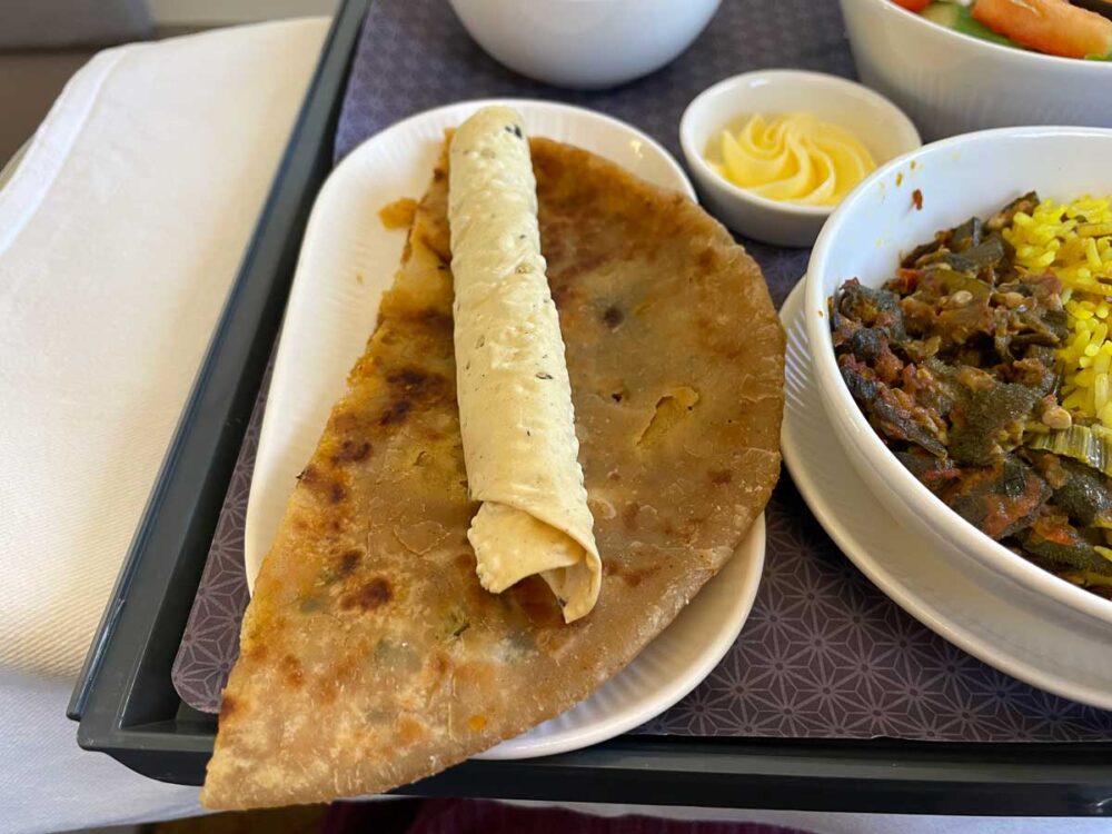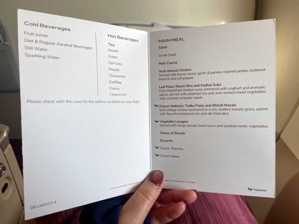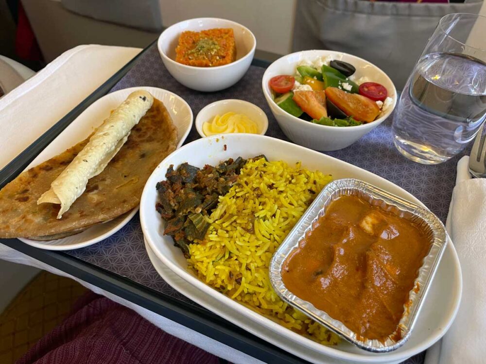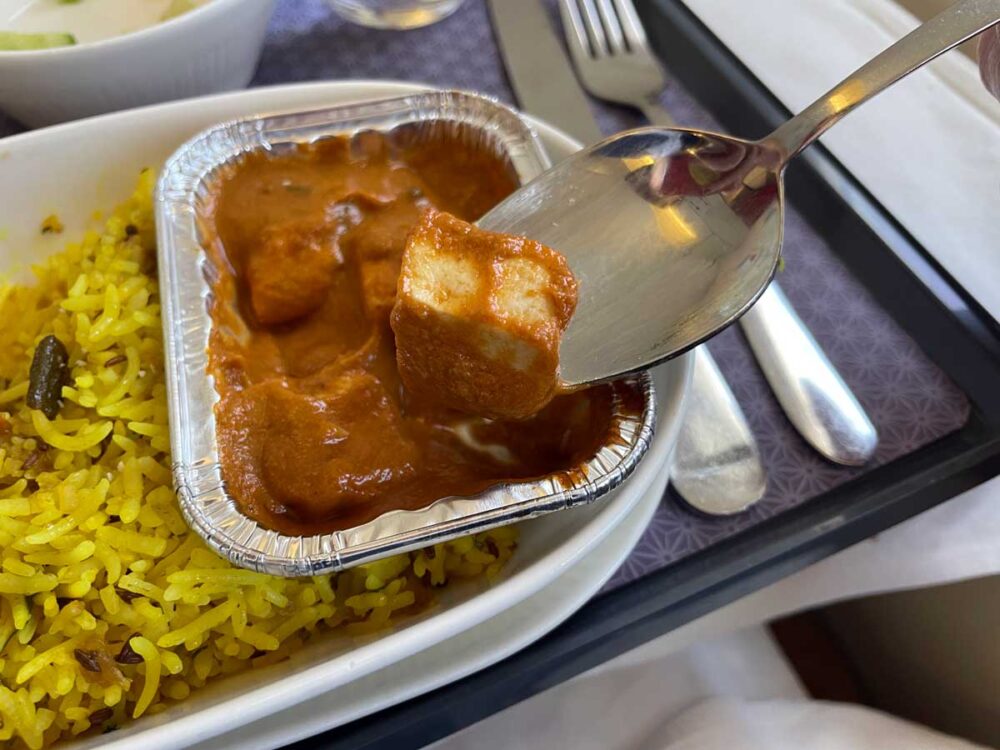 機内食メイン4択。 せっかくだからインドっぽいのがいいけど、 もうほんとにカレーとビリヤニはお腹いっぱいだから2番目はなしで。 3番目のパニール・マカニってのが美味しそうな雰囲気♡トマトグレービーで煮込んだチーズのお料理って珍しいしこれにしよう!
