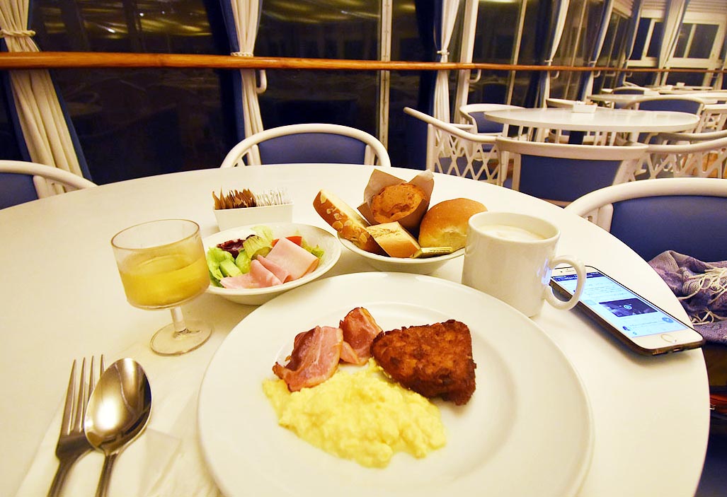 その足でデッキ9のレストランへ。2か所にあるビュッフェレストランはどちらも朝6時からオープンしているので早めの朝食をいただく。一番乗りで誰もおらず貸し切り状態。メニューは一般的なものが並ぶが毎日少しづつ変わる。マフィンがおいしくてお気に入り♪コーヒーやジュースなどは自由にマシンで自分で入れて飲むスタイル。