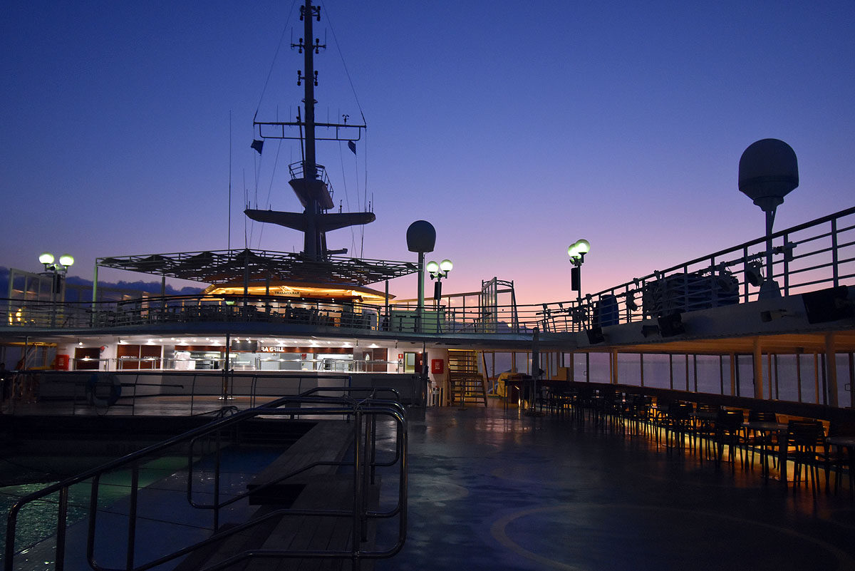 早朝6時前、デッキ10の甲板に出ると外はまだ暗闇の中。船のスピードは感じないが風が強いのは相当速い速度なのだろう。下に目をやると波をかき分けて進んでいるのが分かる。