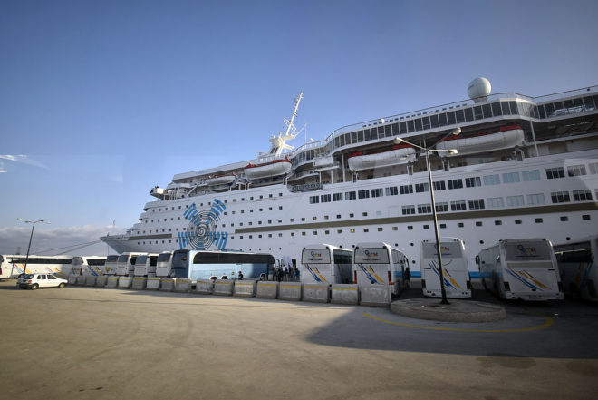 ここロドス島では無料のエクスカーション(ツアー)がついていて参加者は7時半にデッキ5のラウンジ集合となっている。いったん部屋に戻り準備をしてラウンジへ向かった。ラウンジの窓から外を見るとたくさんのバスが既に待機していた。20台はありそう。ここでのツアーは個人手配の日本人15名とクラブツーリズム20数名全員が同じ一台のバスになる。クルーズ側が手配した英語ガイドがつくのだけど、クラブツーリズムの日本人添乗員さんがまとめて面倒みてくれることに。個人手配の我々にとっては恐縮しきりですが柔軟な対応だなぁと感心。