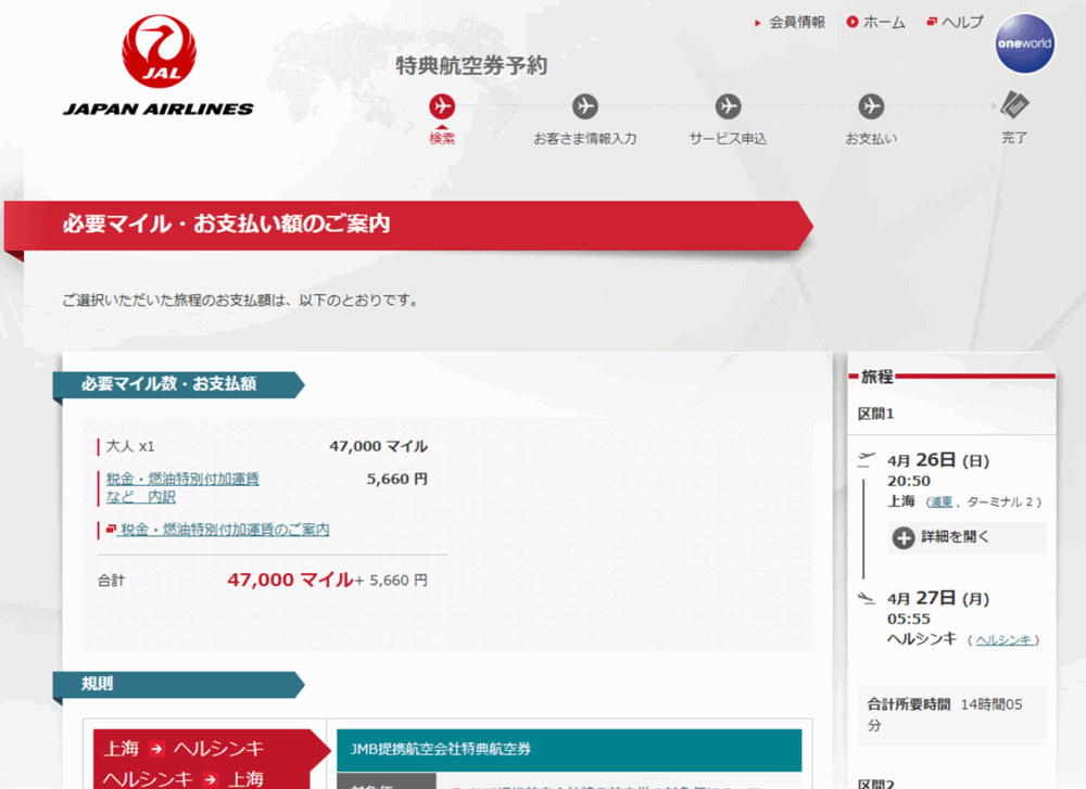 中国 上海 ⇄ ヘルシンキを47,000マイルで予約しました。