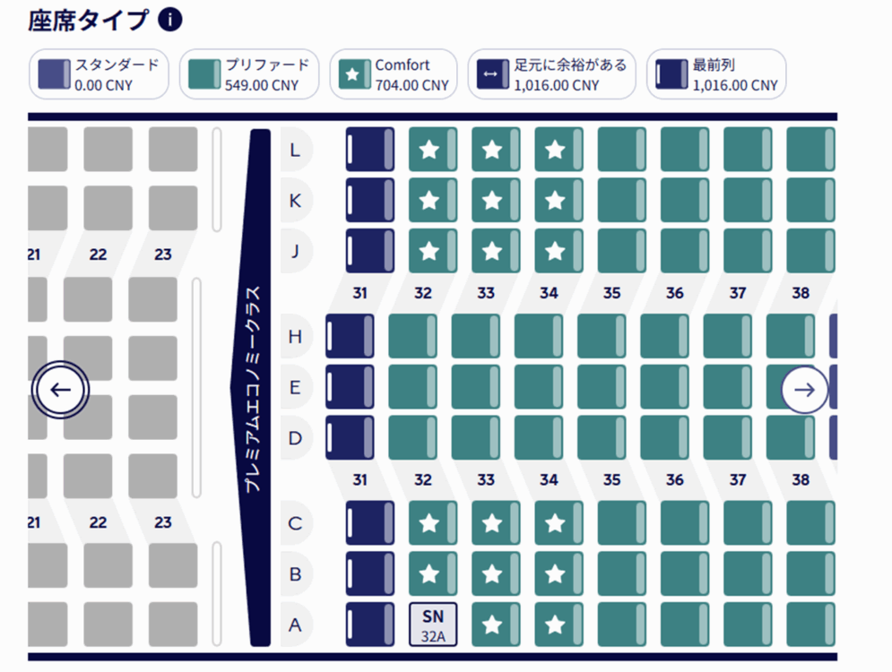 変更ボタンを押すと、座席指定画面が出てきて、同じクラスか無料座席へは変更ができそうでした。プリファードやコンフォートには変更できないようになっていました。