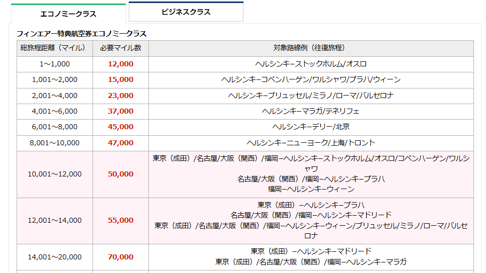 ヘルシンキまでの単純往復でエコノミークラスの場合50,000マイルです。