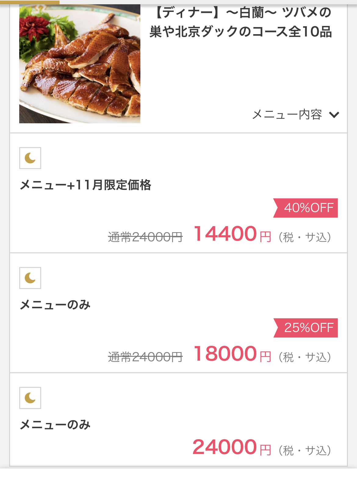 優待内容:(1)(ランチ)百合(1名 11,504円/税込)、(2)(ディナー)白蘭(1名 21,238円/税込)をご予約いただくと、(1)13,000円(税サ込)、(2)24,000円(税サ込)が1名無料となります。