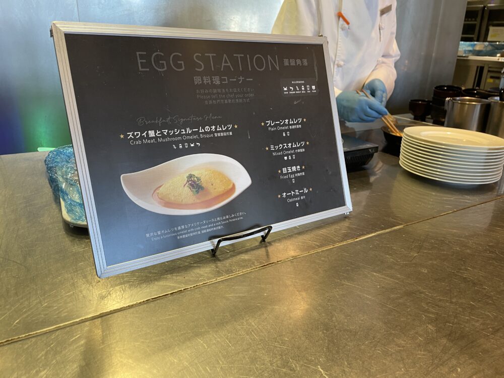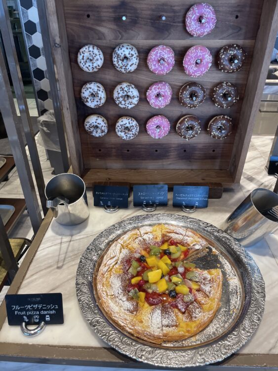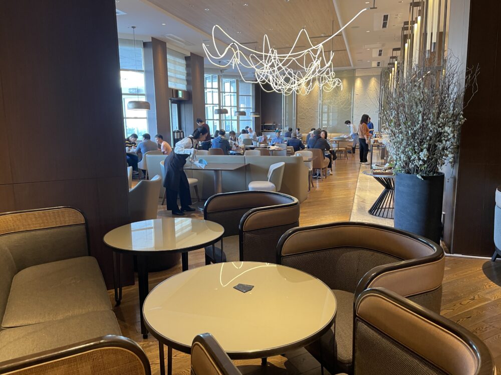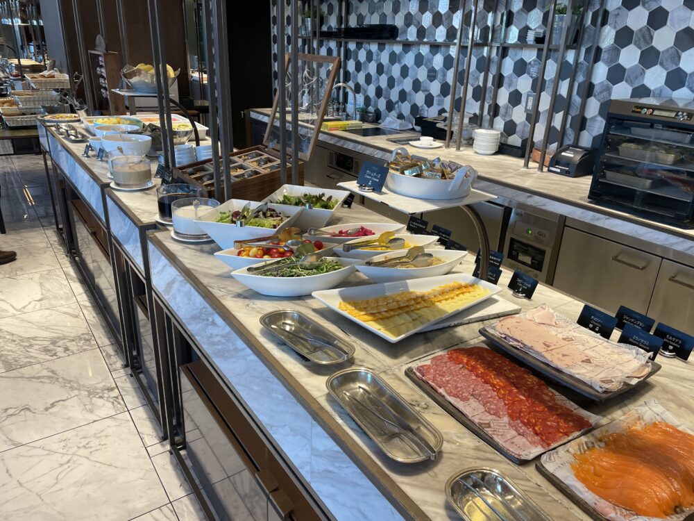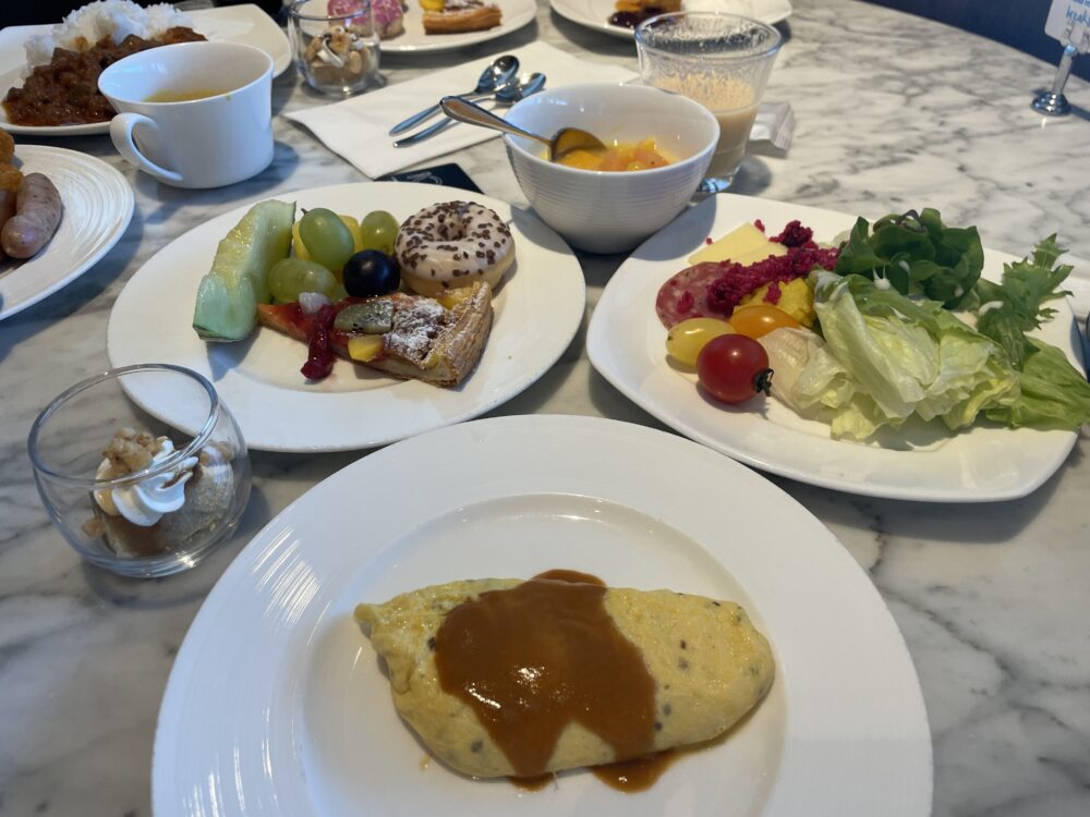 1階シープケーステラス&グリロジーでの朝食ビュッフェ。通常大人 4,200円がゴールドオナーズゲストは無料。窓際の良い席に案内してもらったり、オリジナルミニスイーツをもらえたりのサービスも。