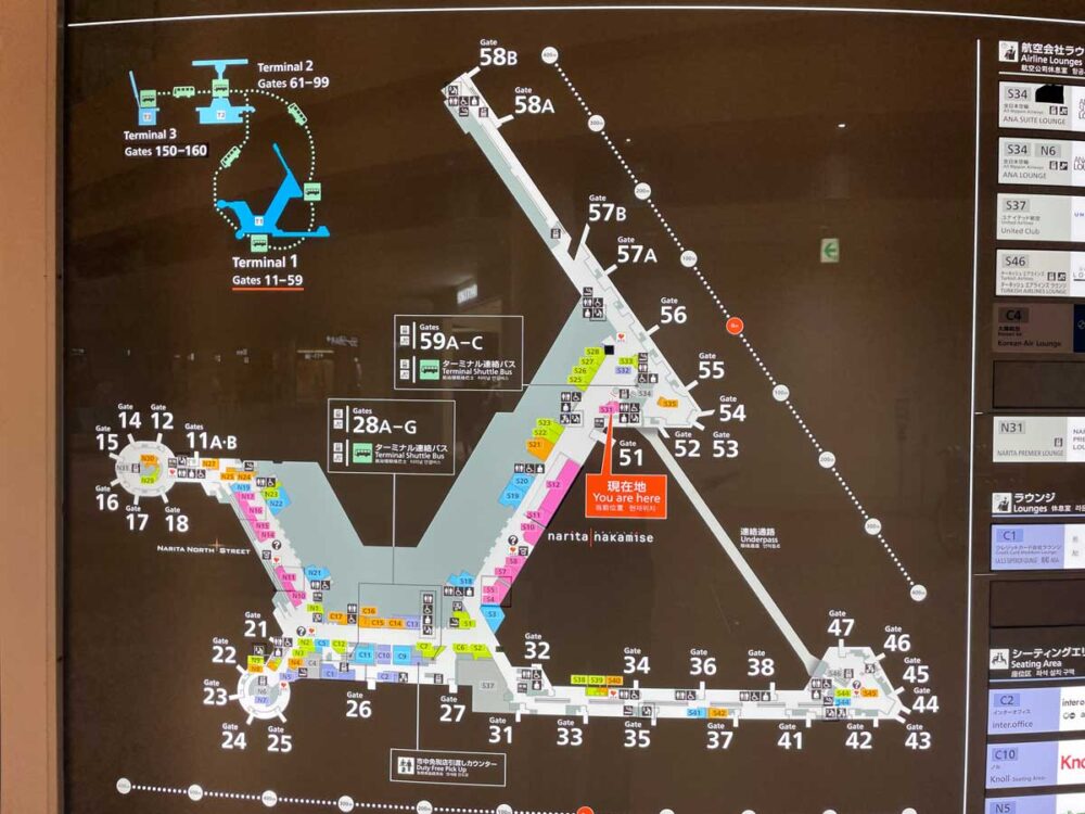 ところが。地図には「××サテライト」という表記が一切ないので道に迷うことになる。みつけた「ANA LOUNG」の案内に従ってかなり歩いていくと、到着したところで私が行こうとしていたラウンジではないと気づき来た道を大きく戻る。案内が不親切すぎやしませんか。「××サテライト」ではなく近くのゲート番号で覚えておいたほうがいいです。