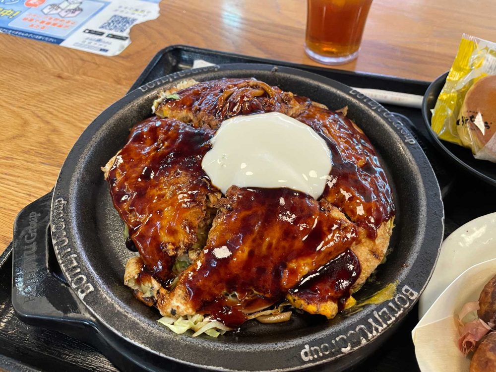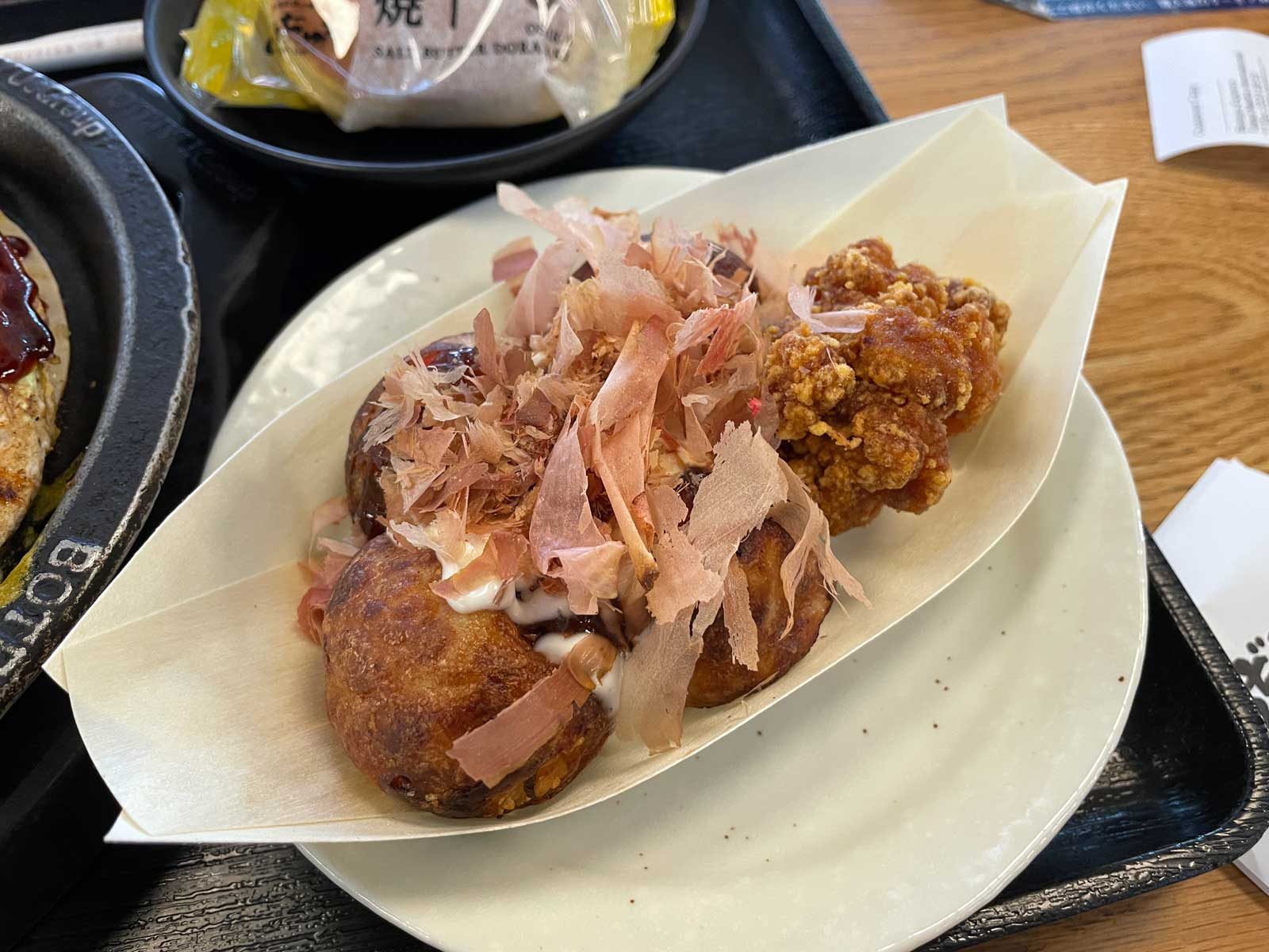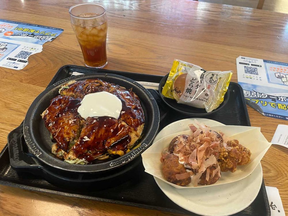 ミックスモダン焼き、たこ焼き4個、から揚げ、バターどら焼き、ドリンク。ビールも選べたけど、アルコールに弱いので。