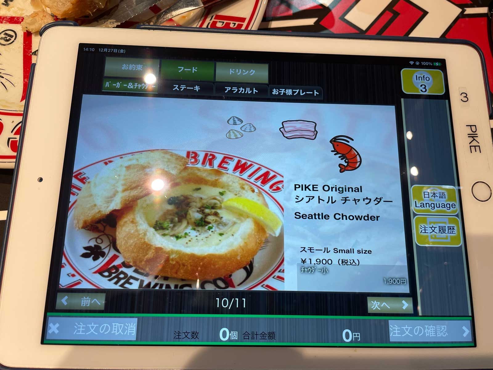 アメリカをテーマにしたレストランでハンバーガーがメイン。メニューの中から自由に選び3400円が割引になる。今回はクラムチャウダー¥1900とミニポテト¥250、ノンアルビール¥550、ソフトドリンク¥300をオーダー。ぴったり3000円で400円ほど使い切れず。