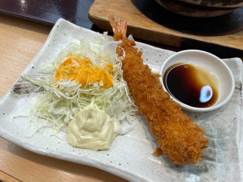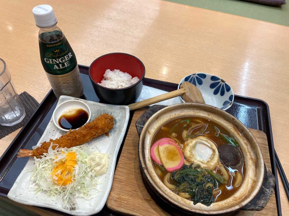 入浴+名古屋めしメニュー+ソフトドリンク&アイスクリームが無料で利用できる。出発前にひとっぷろ♪セットメニューは2種類から選べて、味噌煮込みうどん&エビフライをチョイス。
