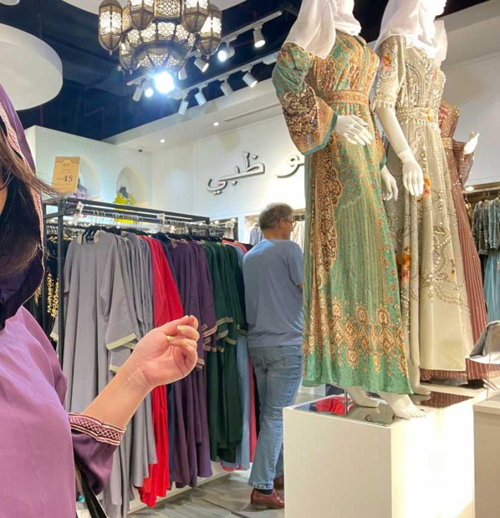 適切な服を持っていない場合は、モスクのエントランスがあるショッピングモールで手軽な価格で売っているので購入するのもいいでしょう。2000円くらいから。お土産にもなるでしょう。私はちゃんと持参していったのにうっかり車の中に忘れてしまい、戻るのも大変なため仕方なく、これを買いました。