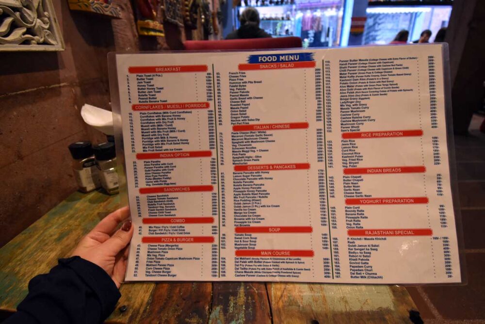 参考価格:マサラティー69ルピー、バタートースト129ルピー、サンドイッチ209ルピー、バナナパンケーキ179ルピー。参考レート1ルピー=1.8円